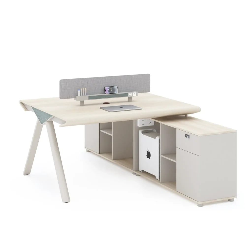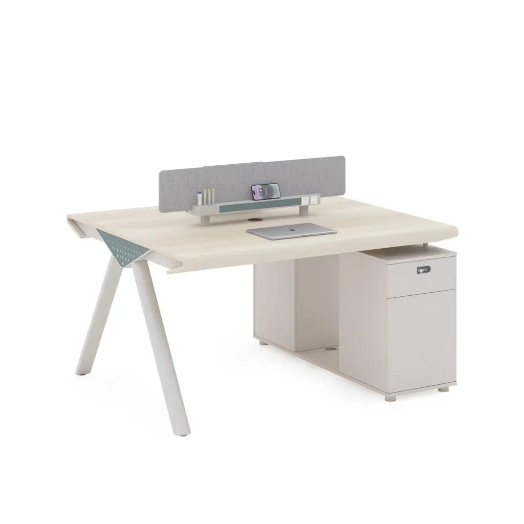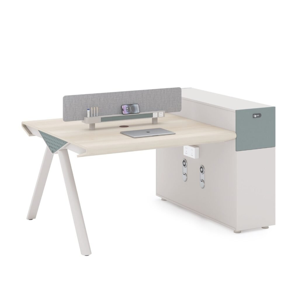 The Workstation Cluster of 2 – Compact Cabinet Design is designed to offer a streamlined two-person workspace with a side storage cabinet, balancing functionality and space efficiency.